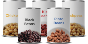 Envase de mantequilla de maní, habichuelas enlatadas o deshidratadas =