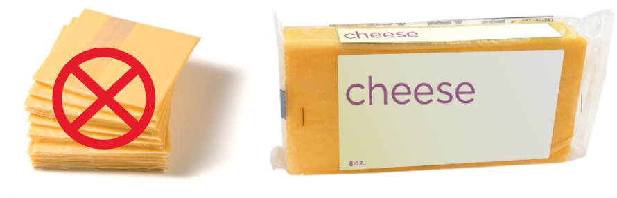 No puede comprar: queso importado, alimentos o productos de queso, queso para untar, queso rallado, queso en rebanadas (excepto el americano), queso con sabores añadidos, rebanadas envueltas en forma individual u orgánico.